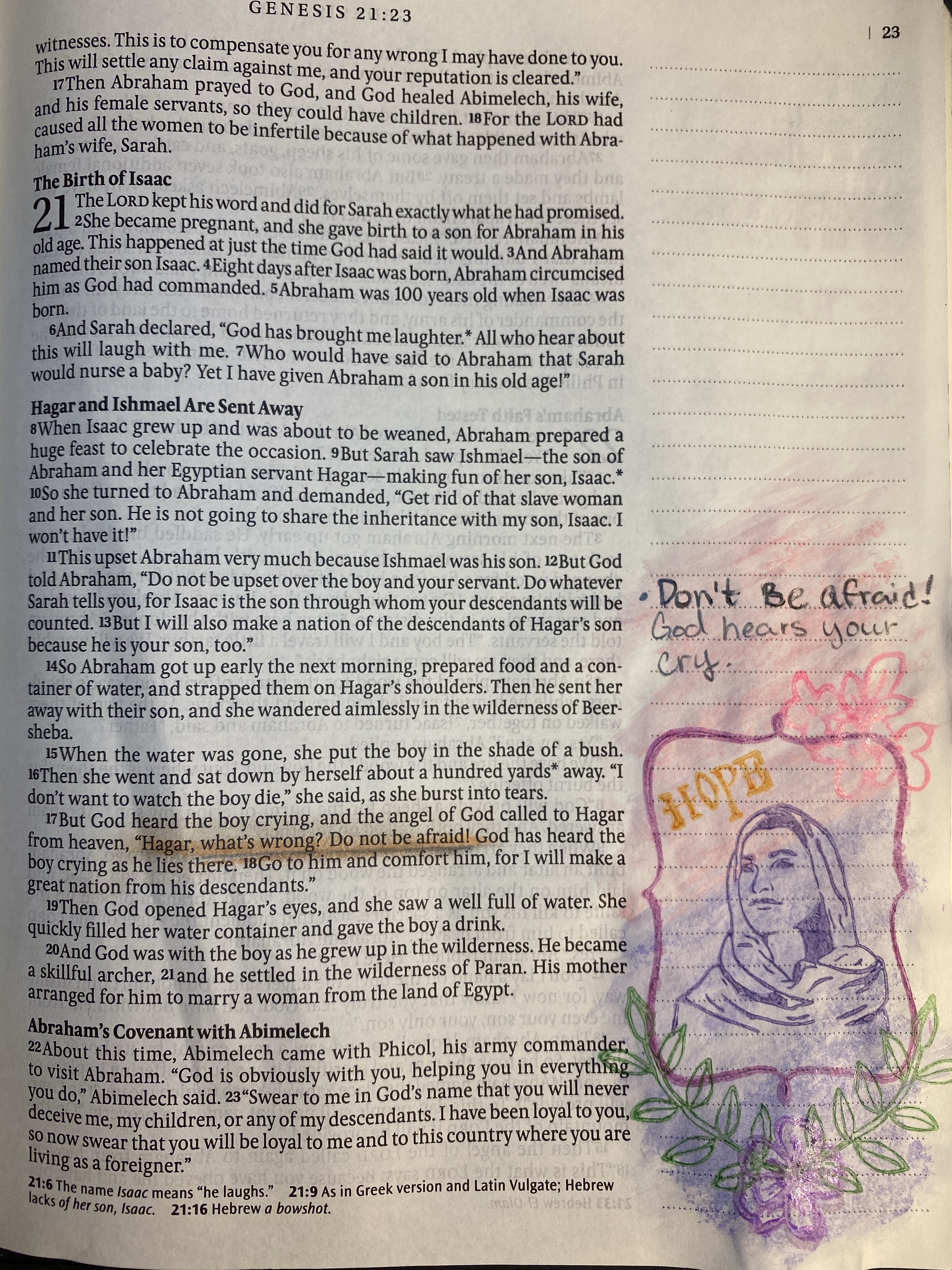 I have been studying Hagar with the ladies in my church. I was reading the passage today, and it is relevant for today. Hagar was concerned for her son who would be dying soon with the lack of food and water. God said to Hagar, “Do not be afraid.” We are in a time where we do not know what tomorrow will look like because it is changing every day.